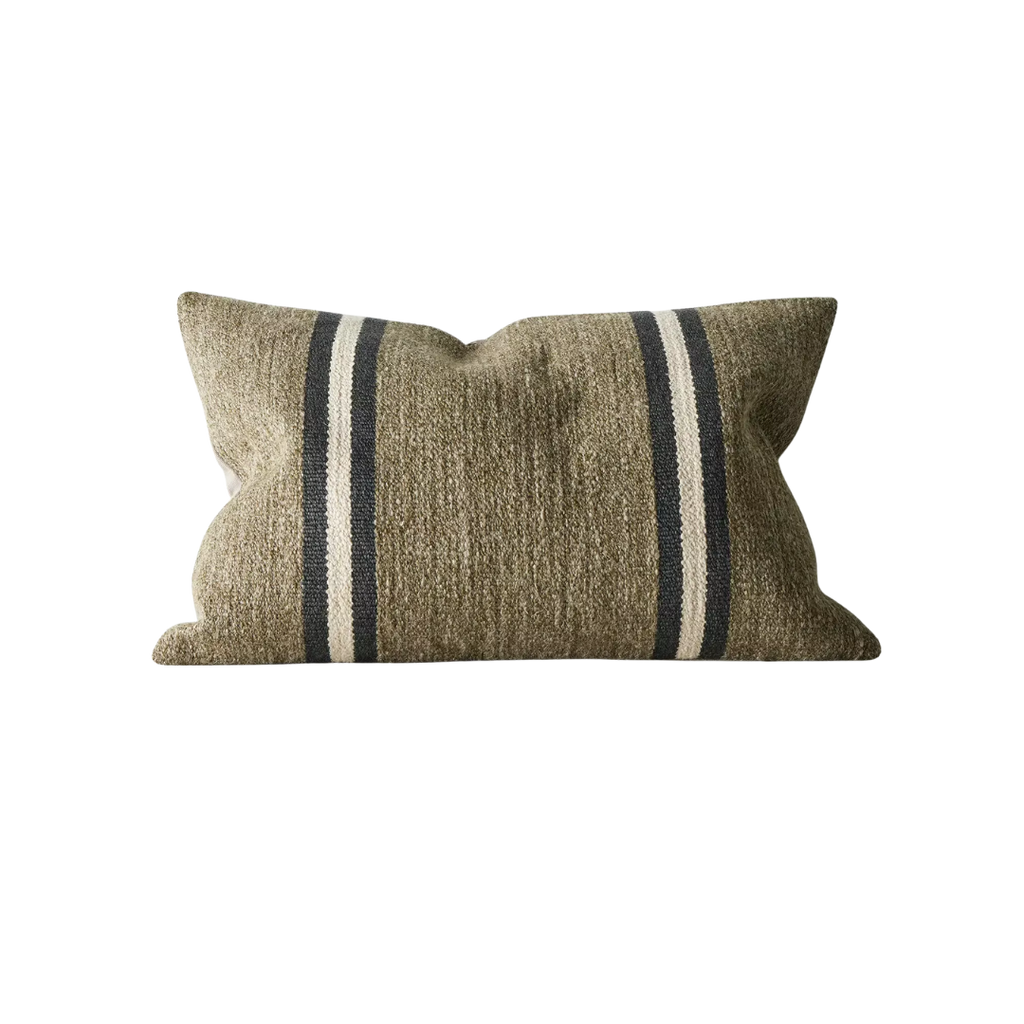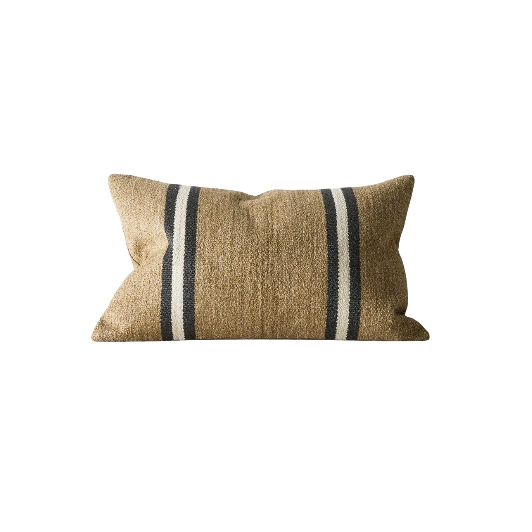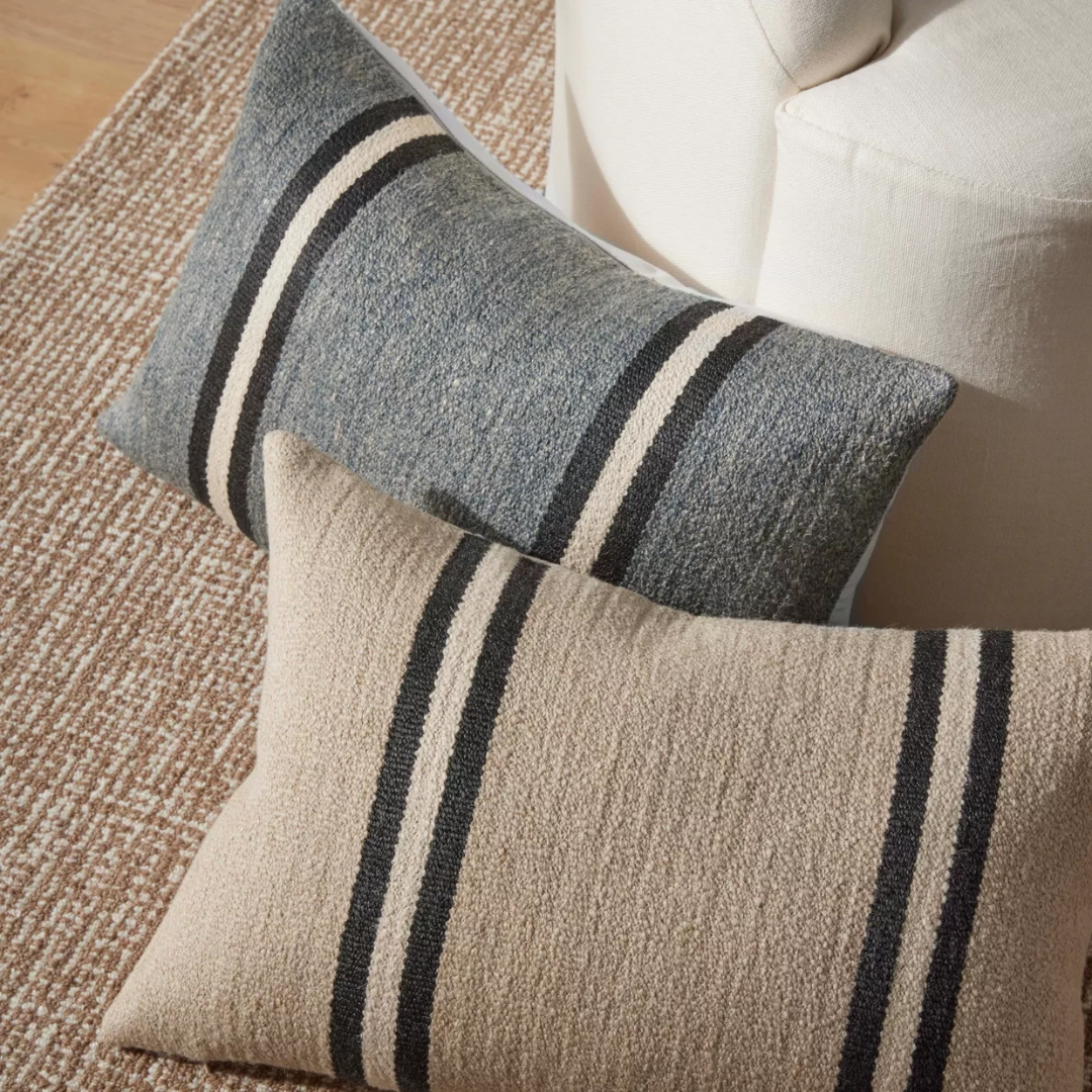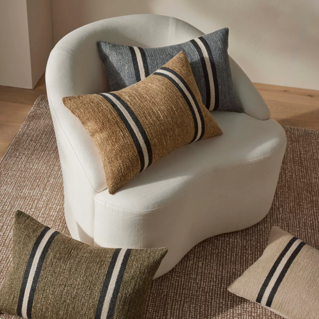 These Mila cushions feature a textured, woven design accented with bold, minimalist stripes for a modern rustic look. Available in warm, earthy tones, they add subtle depth and coziness to any space. Their versatile palette makes the Mila cushions easy to style across a range of contemporary interiors.