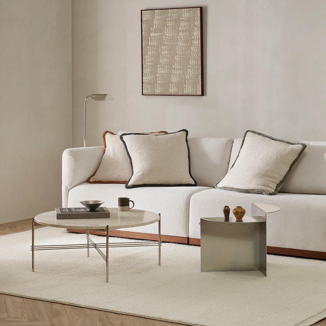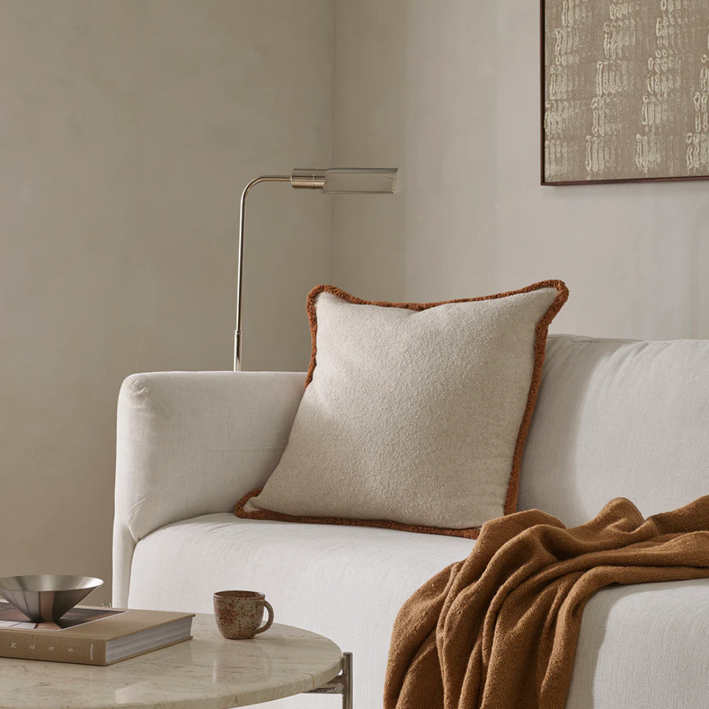 Featuring a soft, off-white bouclé base framed by a chunky cotton fringe, the Darcy cushion’s generous size and inviting texture are designed for effortless layering.