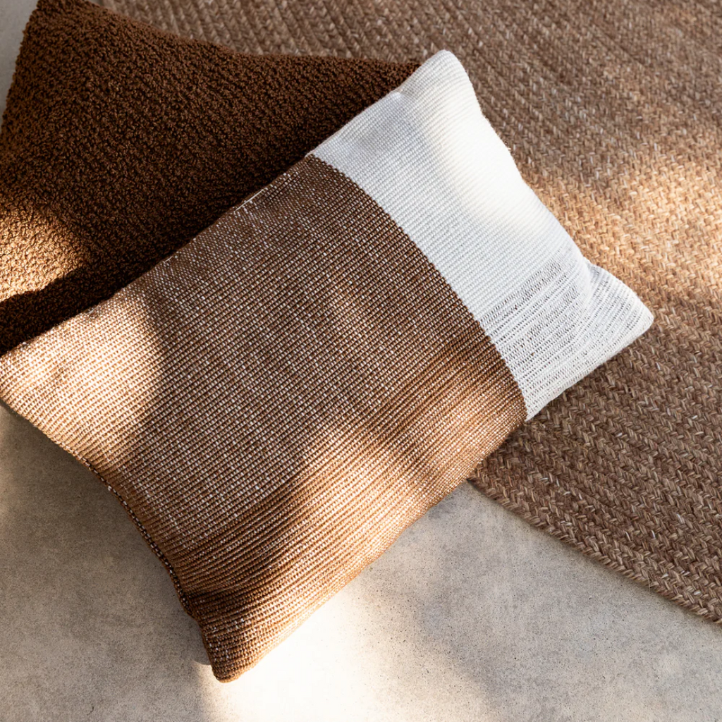 Embrace outdoor luxury with the understated design of our Finn cushion. Crafted from durable PET yarn, tones of nougat and ivory are woven into an offset linear design with a textural finish. A versatile lumbar that is suitable for use both in and outdoor use. This piece is crafted using PET yarn, a resilient fibre made from recycled plastic bottles. In addition to its soft and supple nature, this environmentally conscious product repurposes a resource that is otherwise destined for landfill.