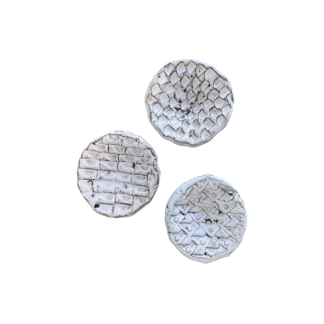 The Little White Textured Ring Dish by Curious Island are a series of individually sculpted dishes, each with a unique hand-etched pattern and finished in a white glaze.