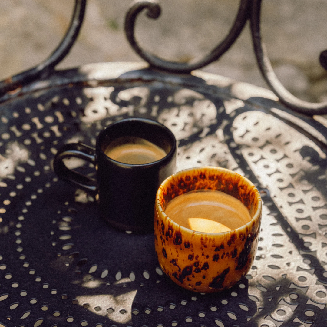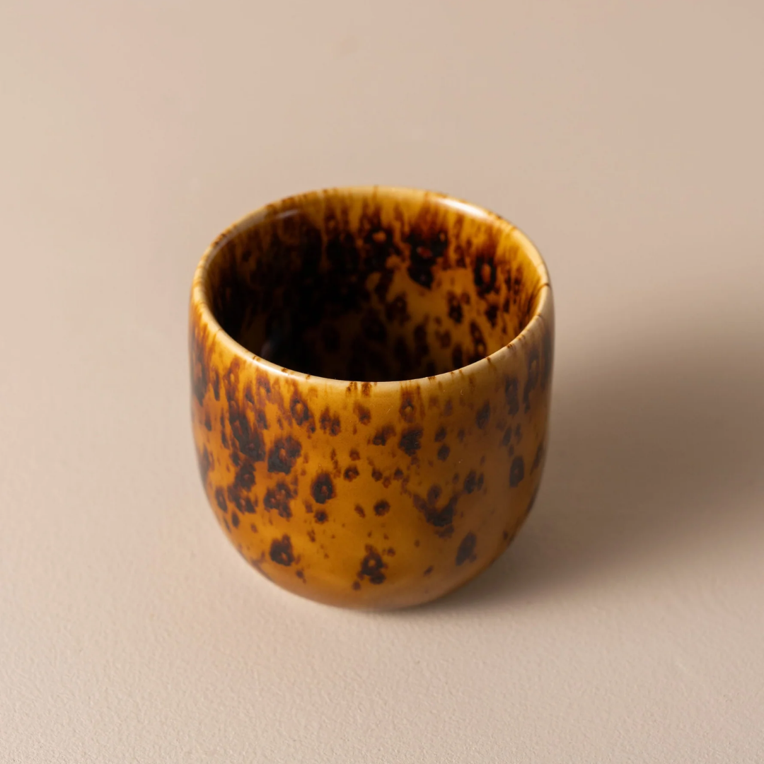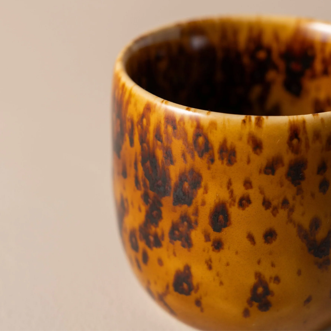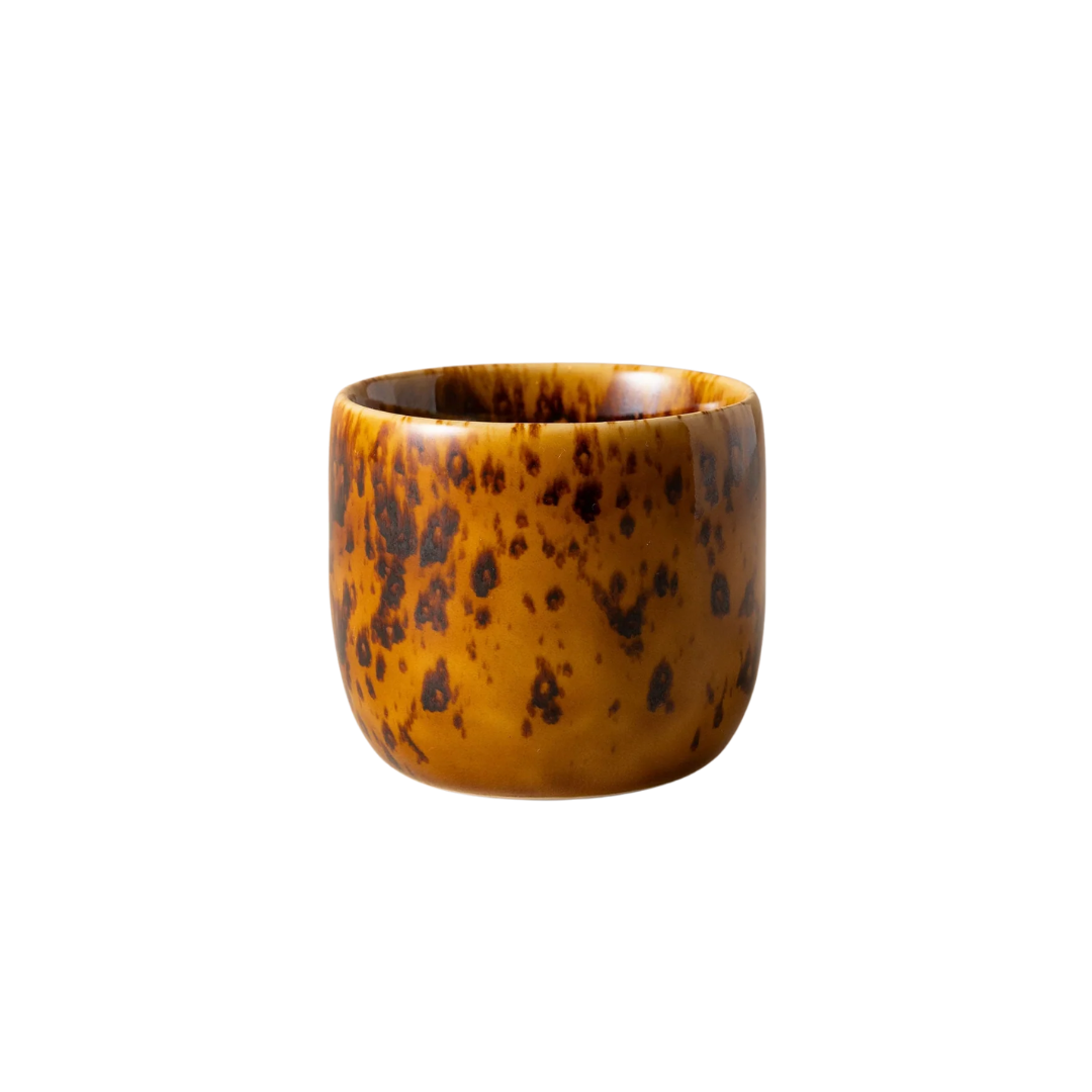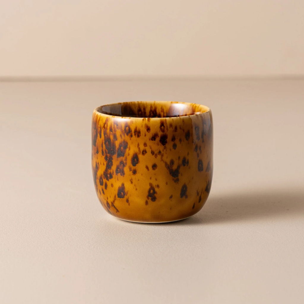 Handcrafted in Portugal, the Sunfleck Espresso Cups glow with the warmth of their amber glaze — each fleck a little sunspot, alive with depth and movement.