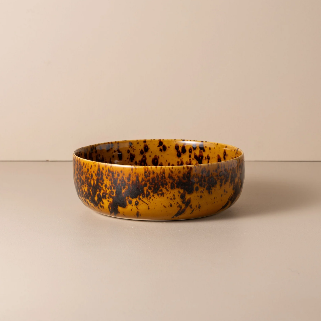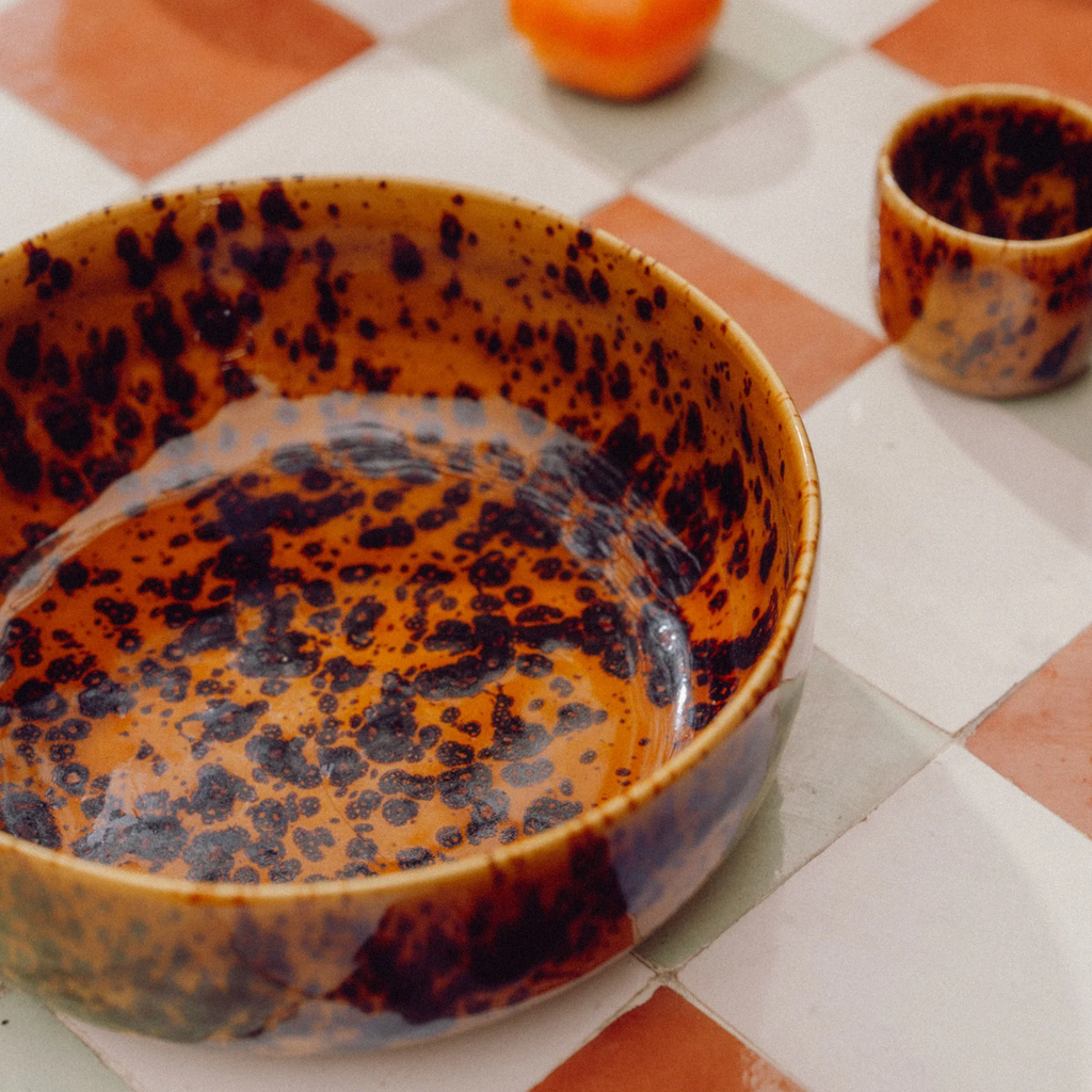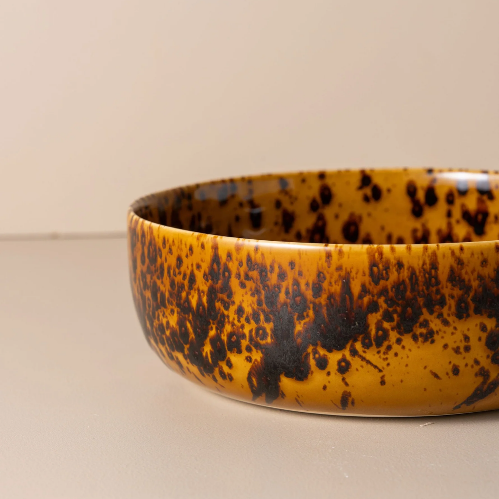 Handcrafted in Portugal, the Sunfleck Serving Bowl glows with a rich amber glaze that dances with the light. Its softly curved form and natural depth make it ideal for shared dishes, fresh salads, or fruit gathered from the market.