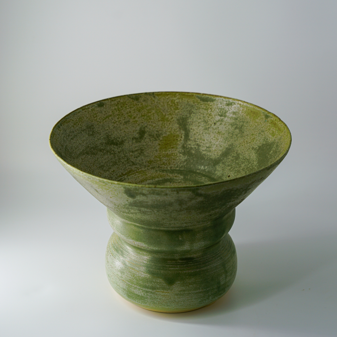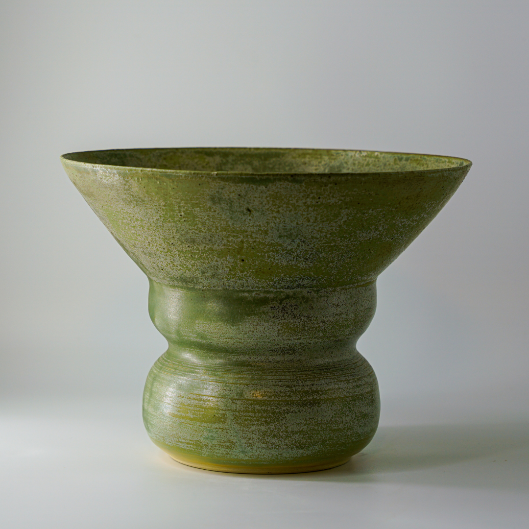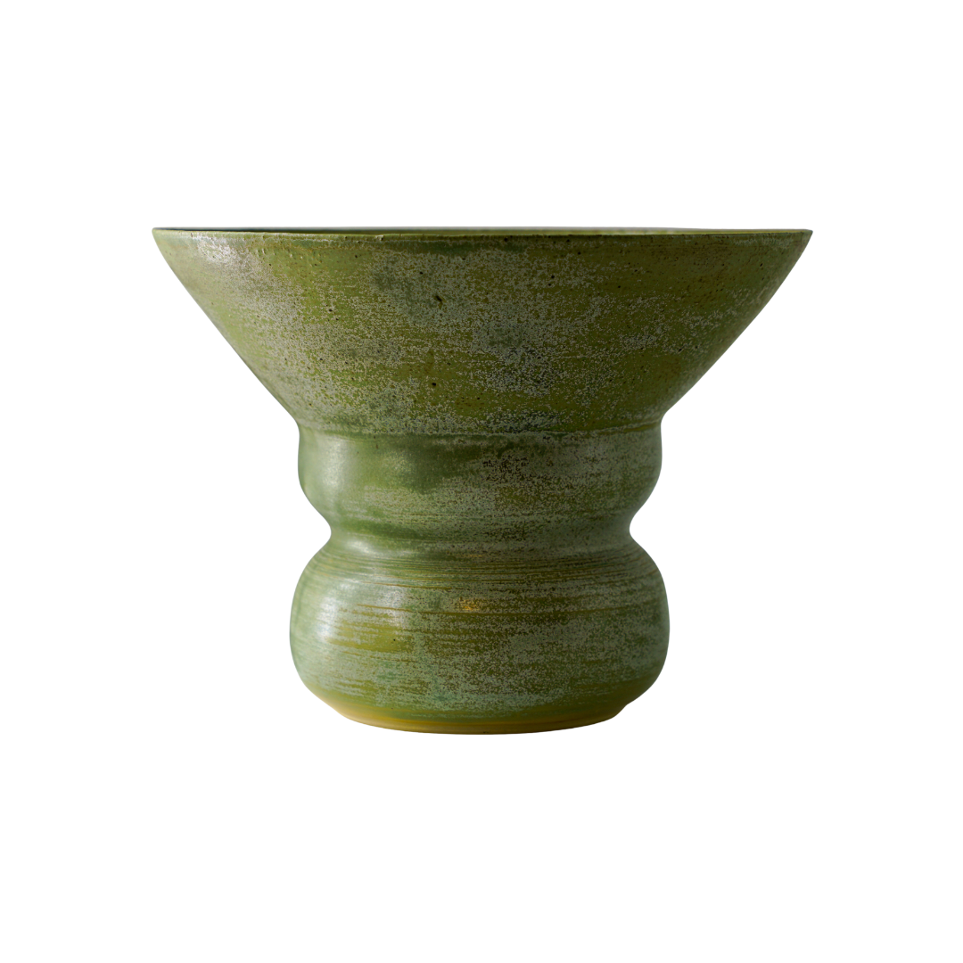 A softly flared ceramic vessel grounded in earthy green tones. Calm, tactile and balances, it reflects a deep connection to land and material.