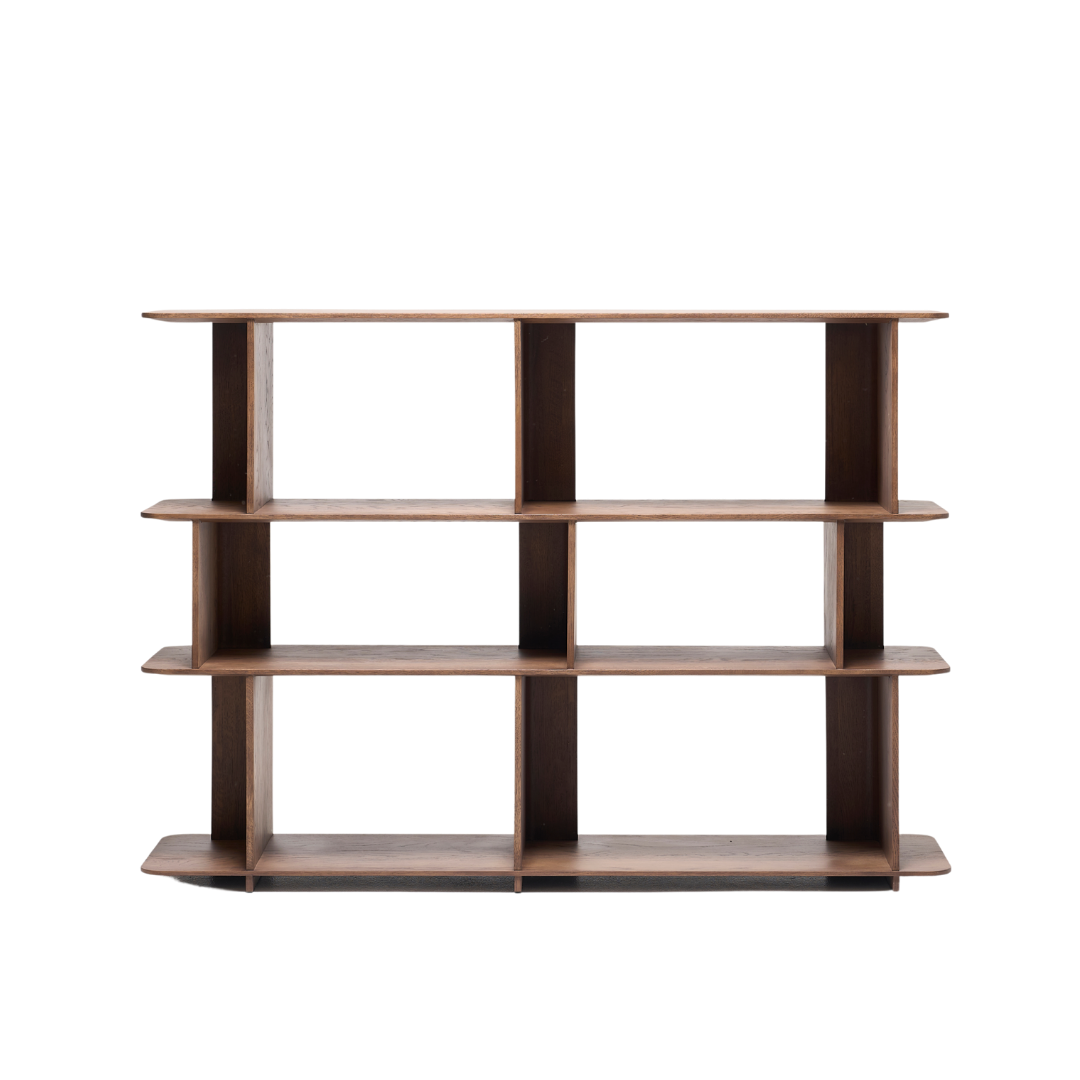 Perpendicular panels intersect to form the uprights, which, arranged in alternating directions, create a feeling of movement and break up the symmetry, while also offering interesting display and storage options.