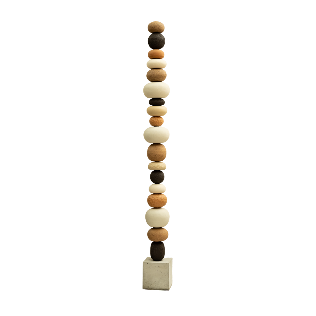 Each piece is hand-shaped and etched by hand, then threaded onto a central totem pole with a solid concrete base, keeping it from tipping. Each piece is numbered for perfect assembly.