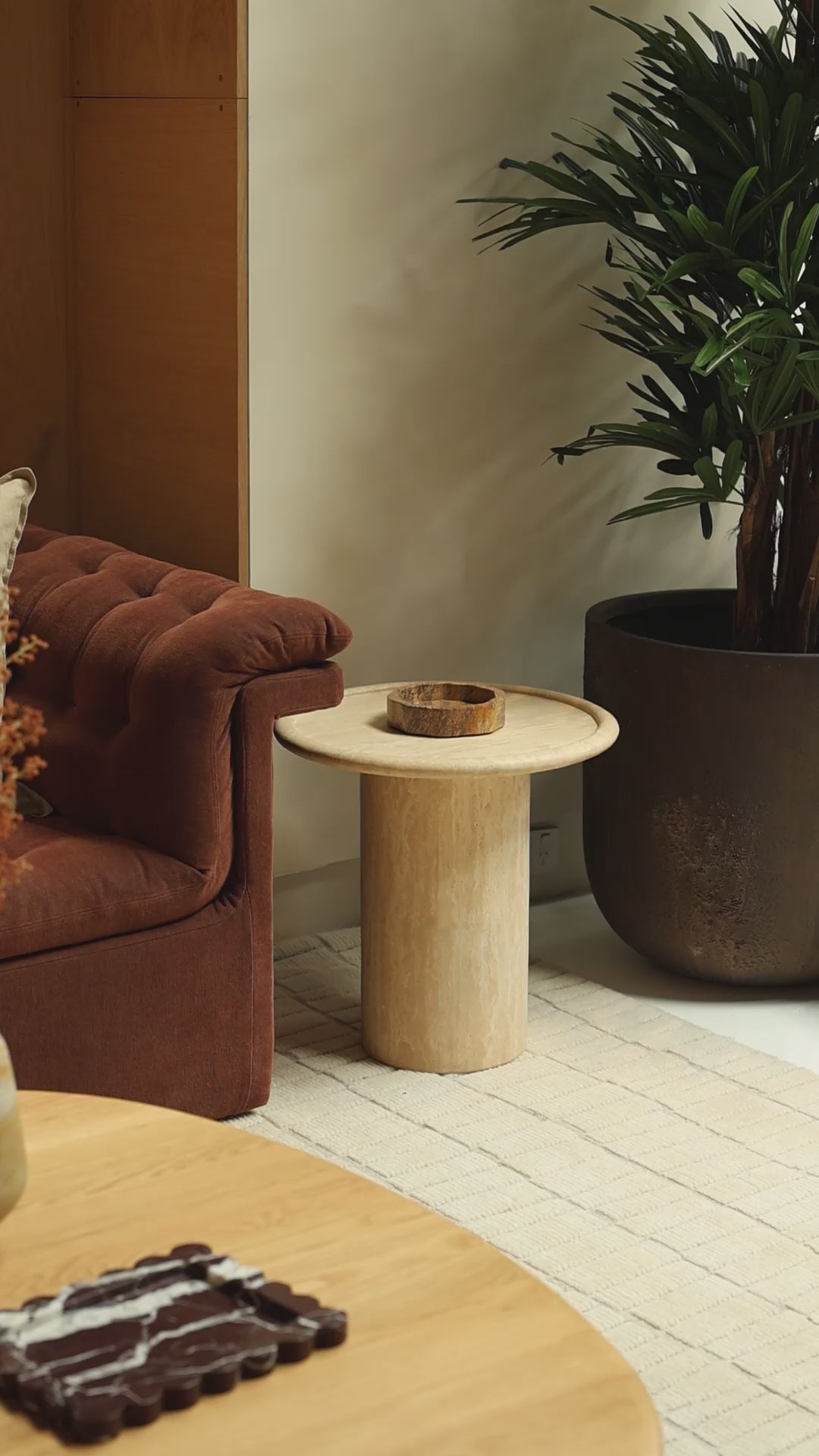 Elevate your living area with the Pippa Marble Side Table in Travertine. Featuring a classic oversized build and natural travertine top, it offers a sophisticated look. Ideal for retreat-style interiors, this side table blends timeless elegance with practical design. Its durable construction ensures long-lasting beauty.