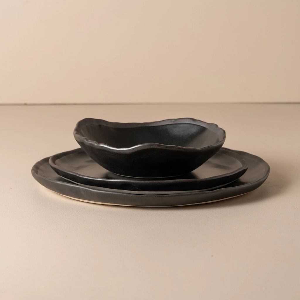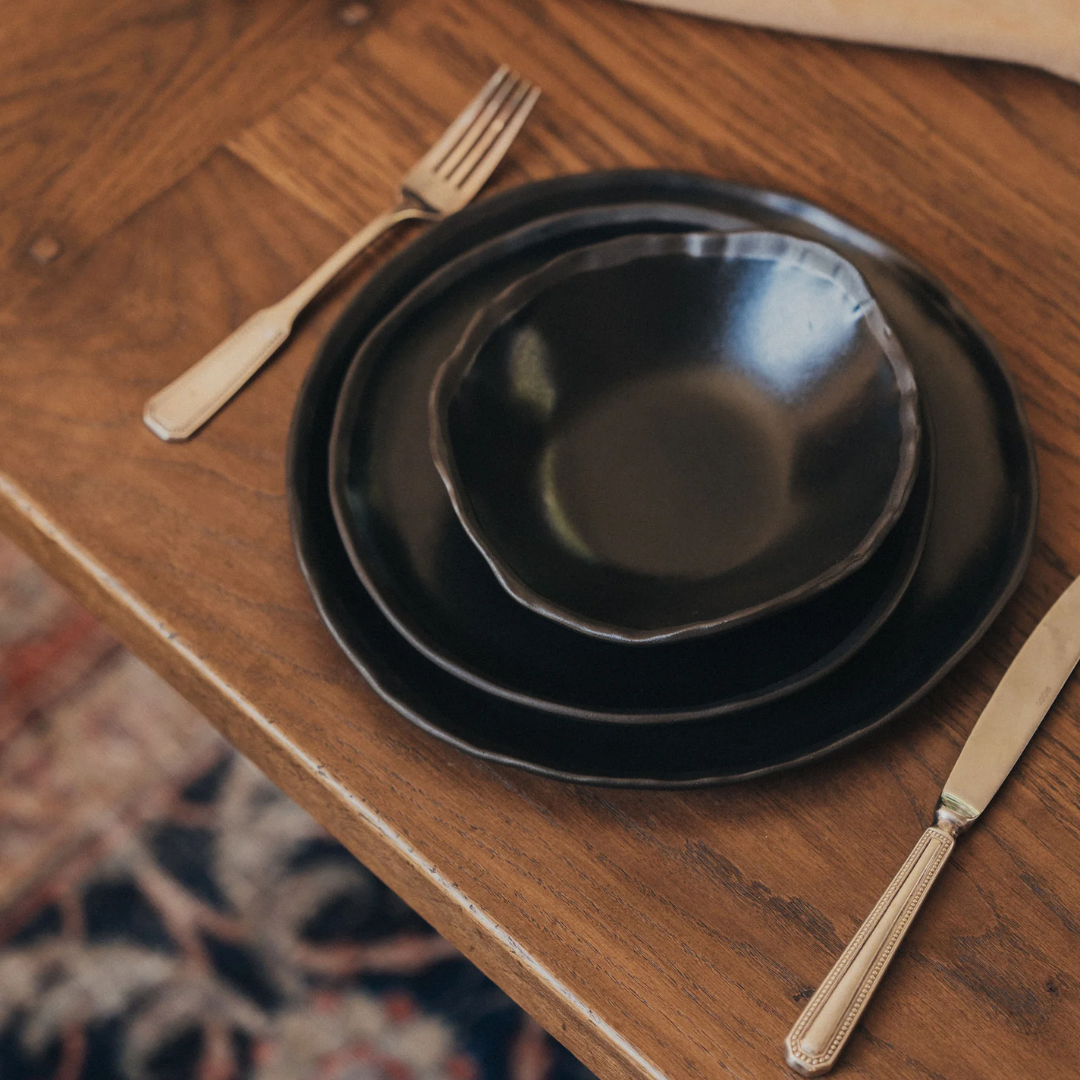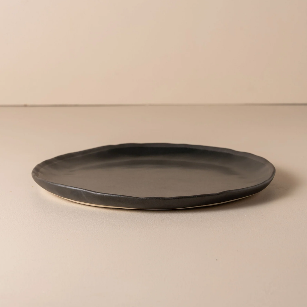 Handcrafted in Portugal, the Escuro Dinner Plate brings quiet strength and softness to the table. Its matte charcoal glaze and organic rim reflect the beauty of human touch — simple, grounded, and enduring.