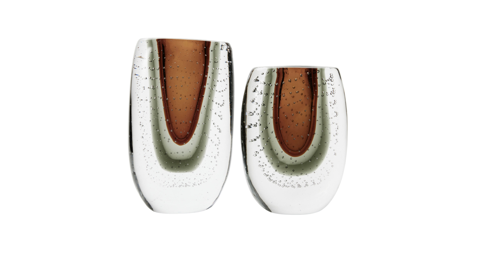 The Jube vase has seemingly floating, amber-toned glass mass featuring like a drop-like element in clear glass, enveloped by a mantle of air bubbles trapped within the glass.