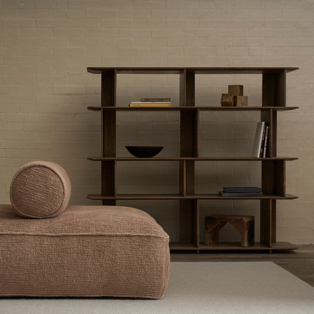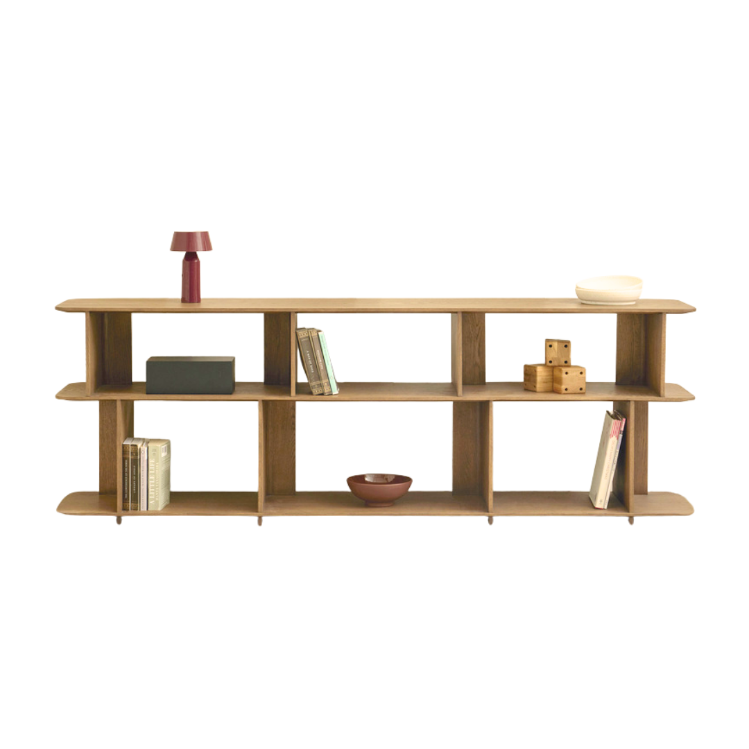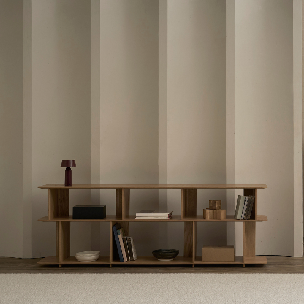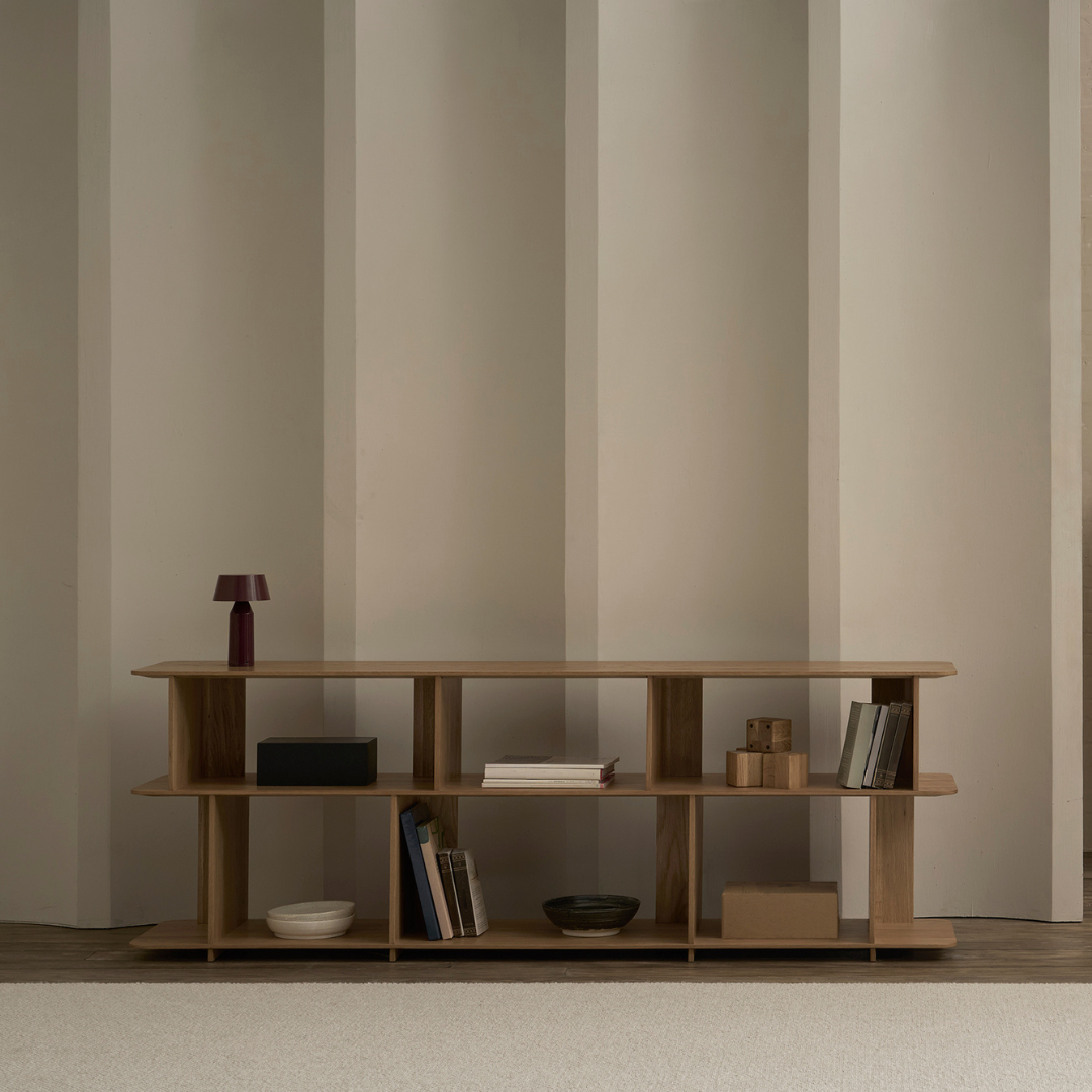 Perpendicular panels intersect to form the uprights, which, arranged in alternating directions, create a feeling of movement and break up the symmetry, while also offering interesting display and storage options.