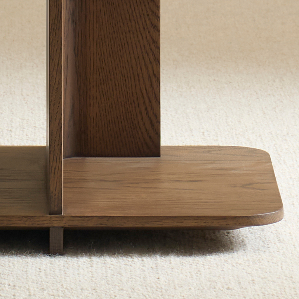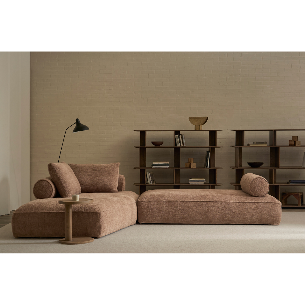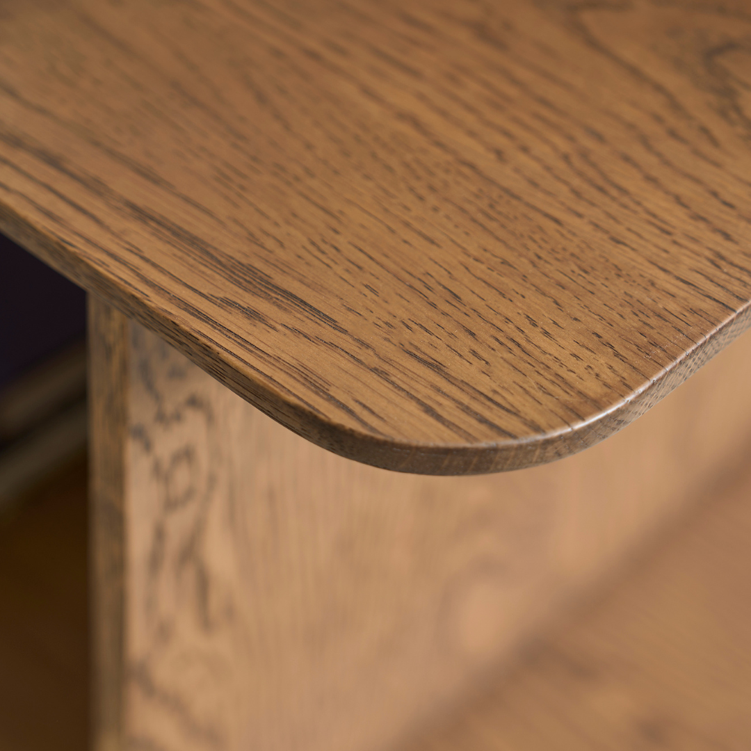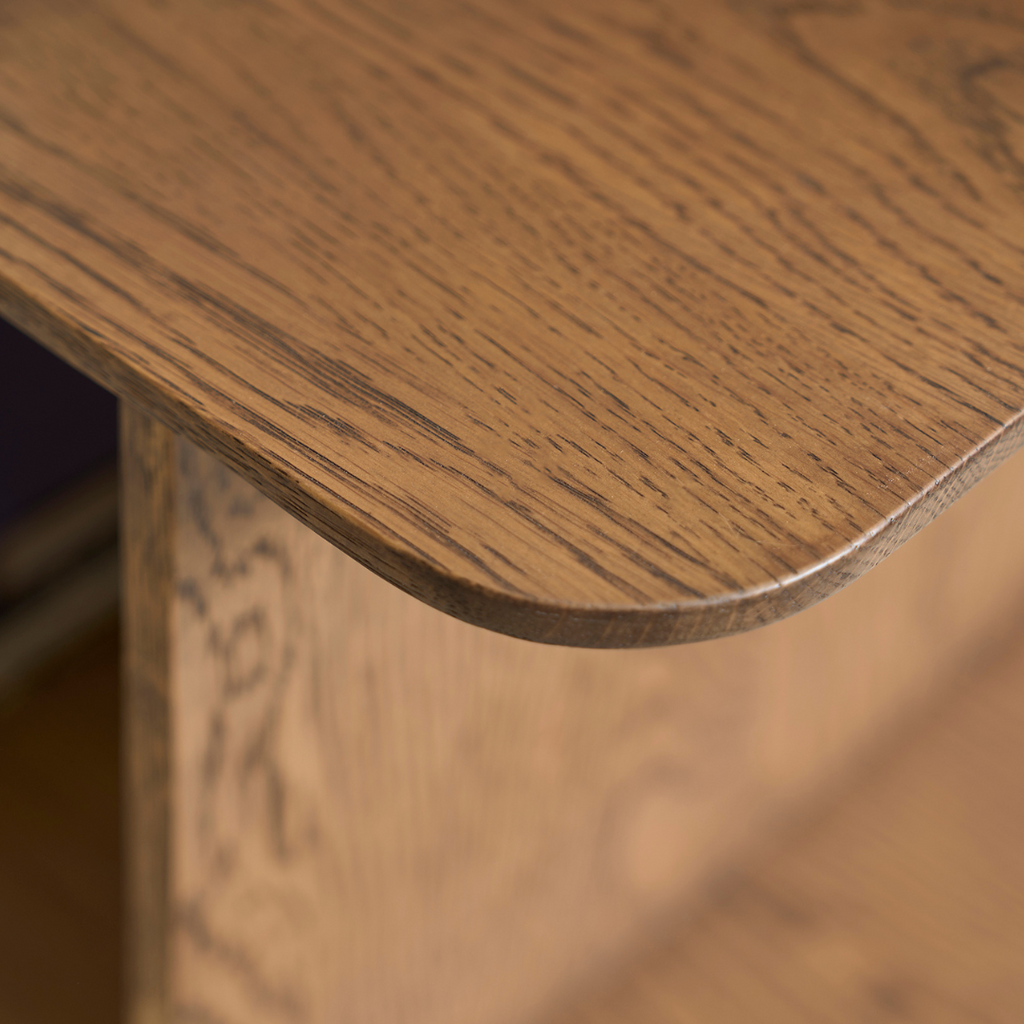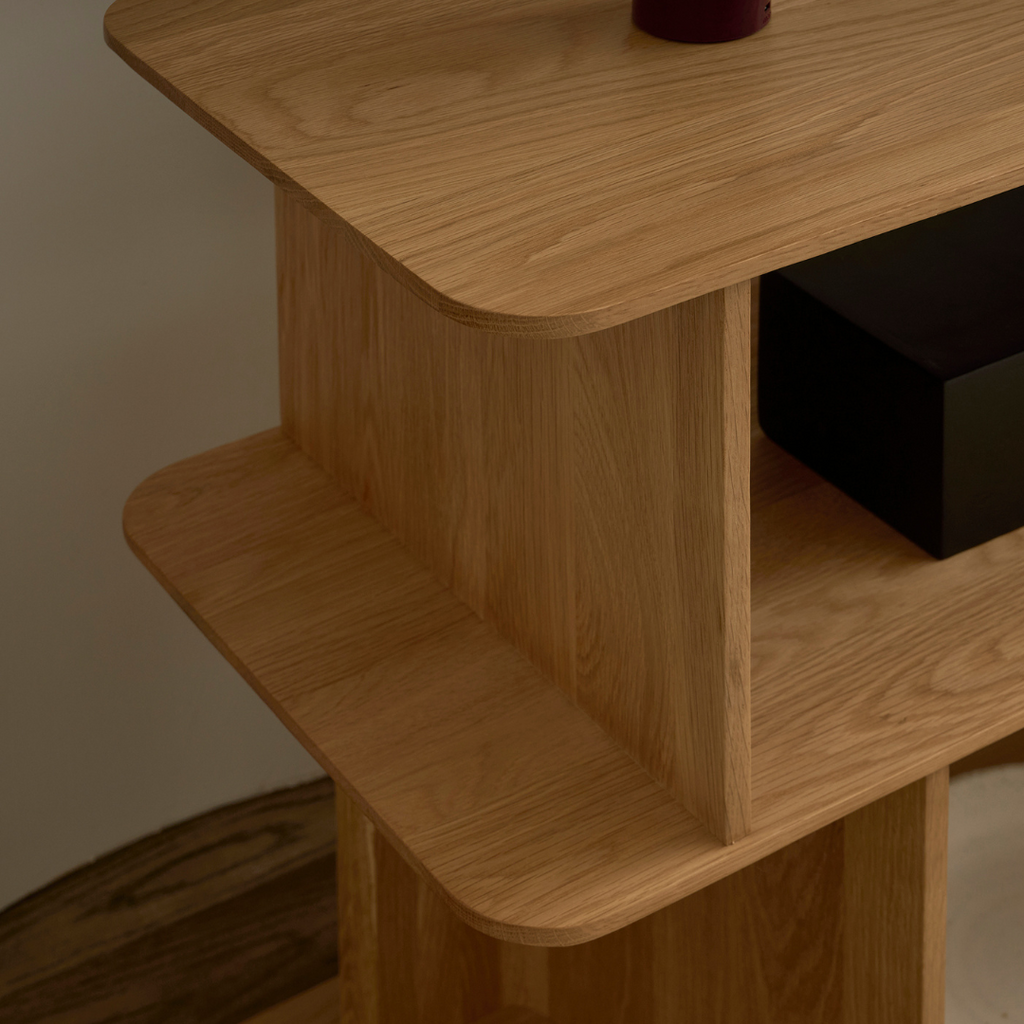 Perpendicular panels intersect to form the uprights, which, arranged in alternating directions, create a feeling of movement and break up the symmetry, while also offering interesting display and storage options.