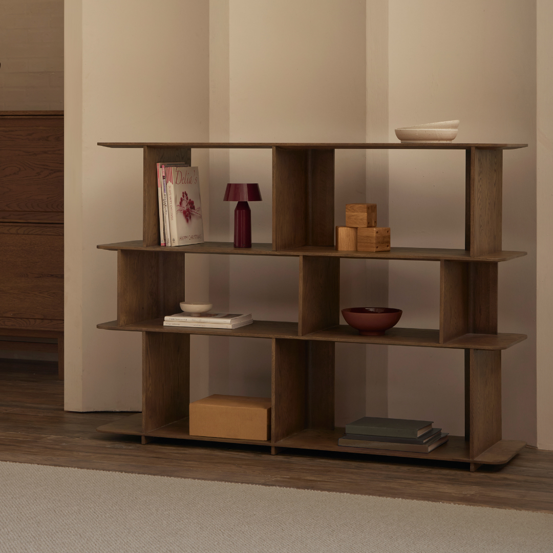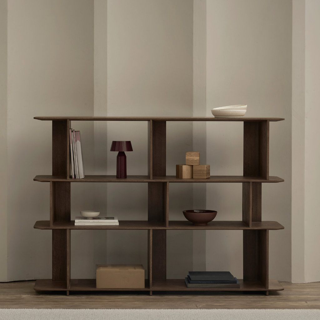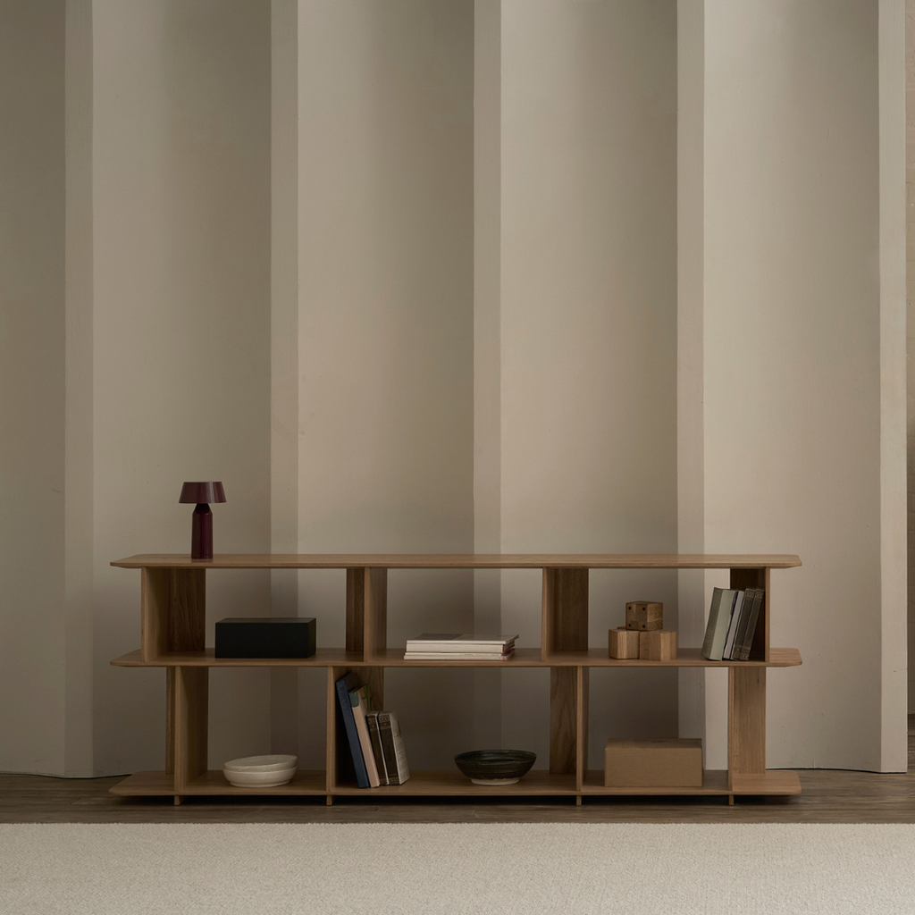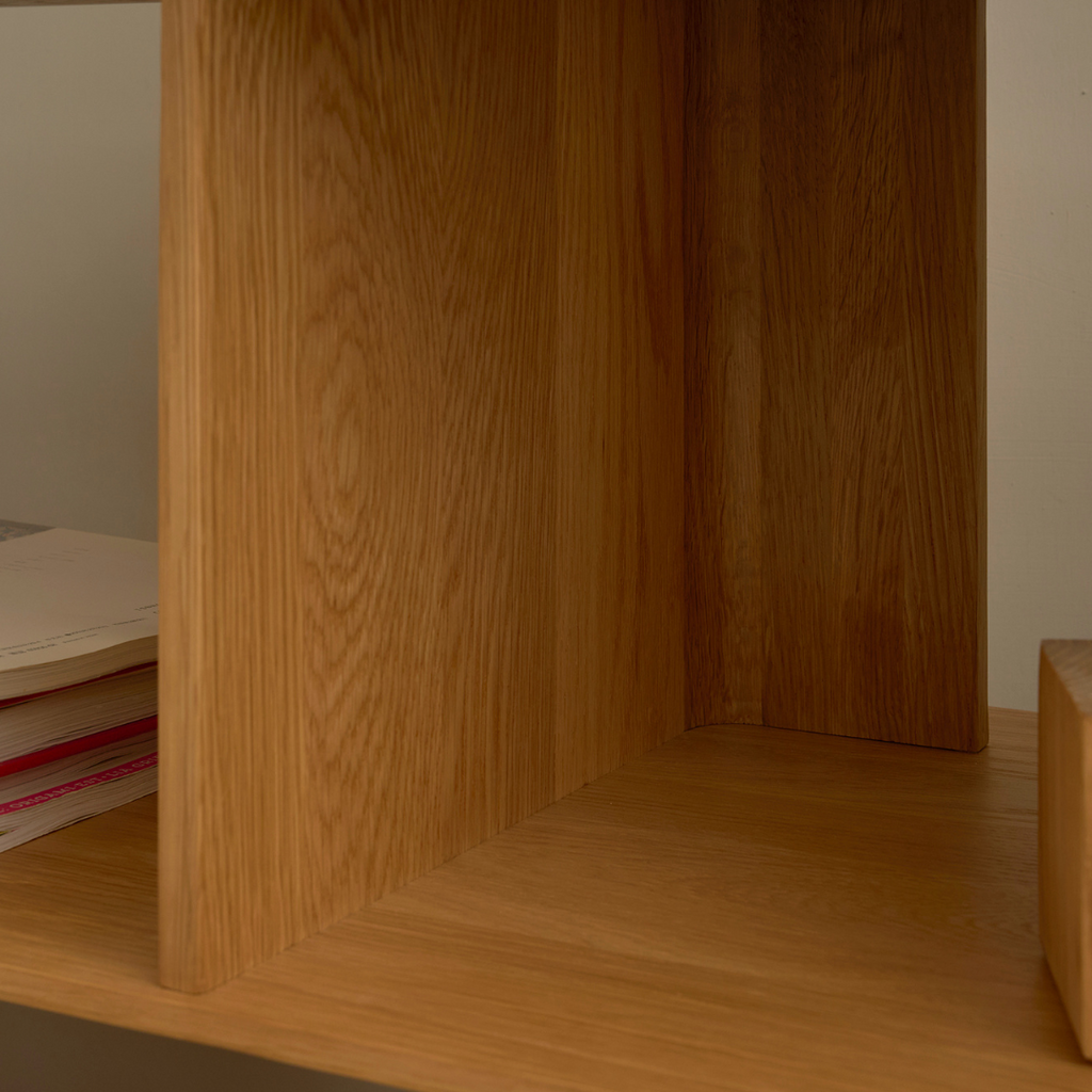 Perpendicular panels intersect to form the uprights, which, arranged in alternating directions, create a feeling of movement and break up the symmetry, while also offering interesting display and storage options.