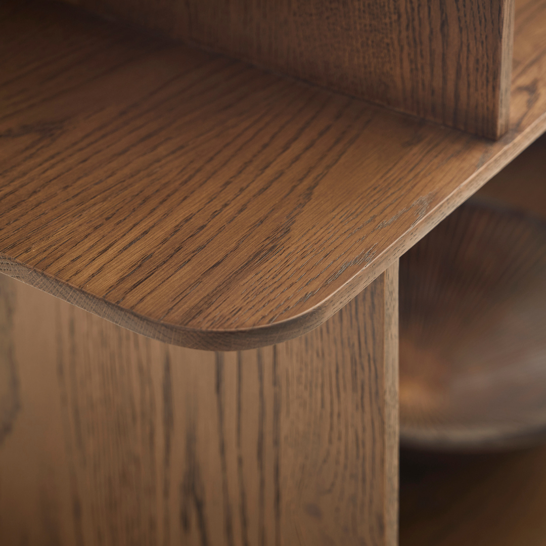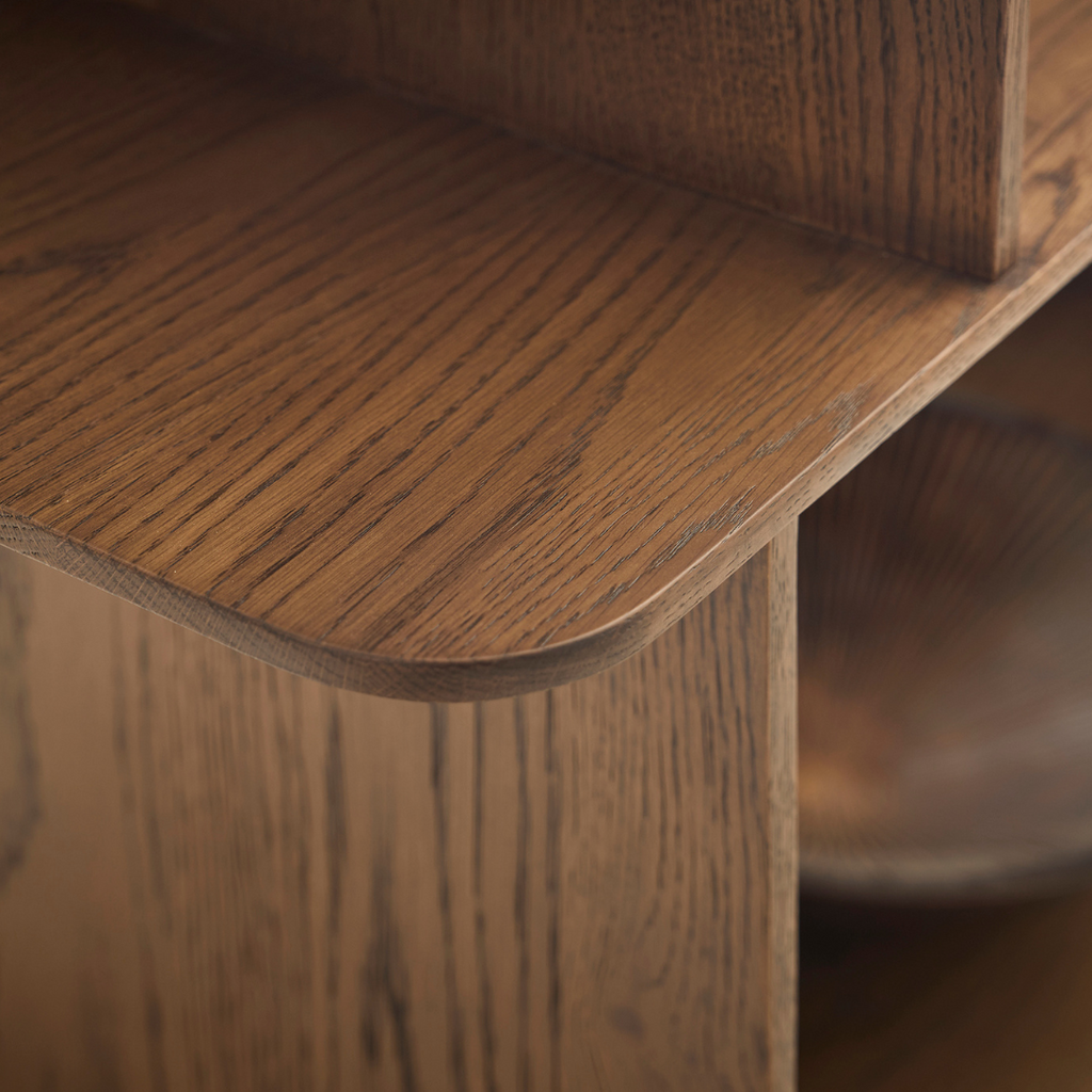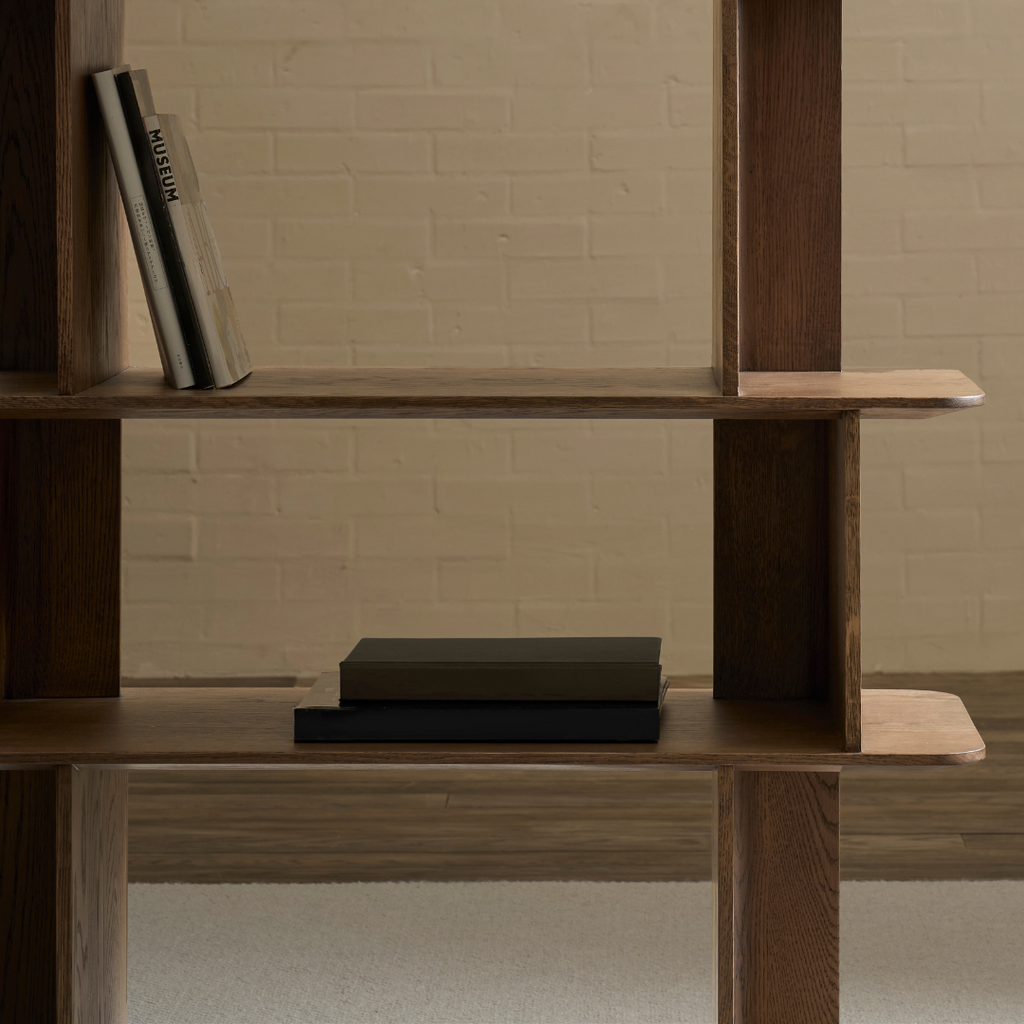 Perpendicular panels intersect to form the uprights, which, arranged in alternating directions, create a feeling of movement and break up the symmetry, while also offering interesting display and storage options.