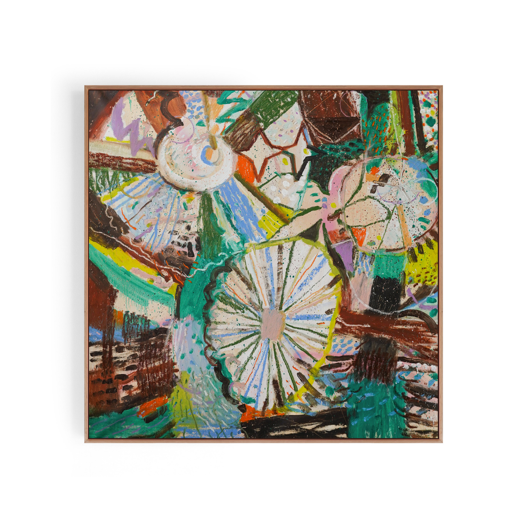 Inspired by a summer camping trip to Woody Head, Rockpools began with shells gathered by hand and sketched back at the cabin. Returning to the studio, those forms expanded across the canvas as layered, circular abstractions. The painting balances instinct with structure, holding movement within structure, much like the tidal pools that first inspired it.